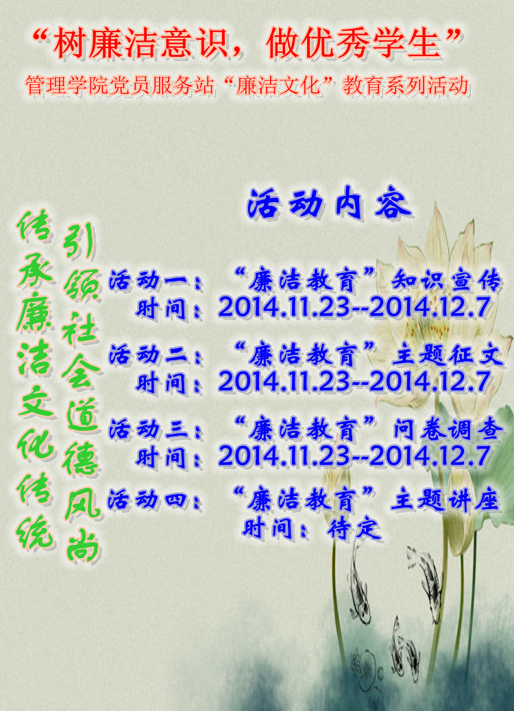 为加深同学们对廉洁文化的理解,管理公司北二、北五党员服务站自11月23日至12月07日开展了为期两周的一系列活动:在北二、北五党服宣传栏张贴廉洁知识宣传海报,同时举行了老员工廉洁意识问卷调查,深入了解了同学们对廉洁的认知水平;开展“廉洁教育”主题征文活动,鼓励同学们拿起自己的笔,畅所欲言地书写对廉洁的理解,表达对党和国家廉政建设的关切。