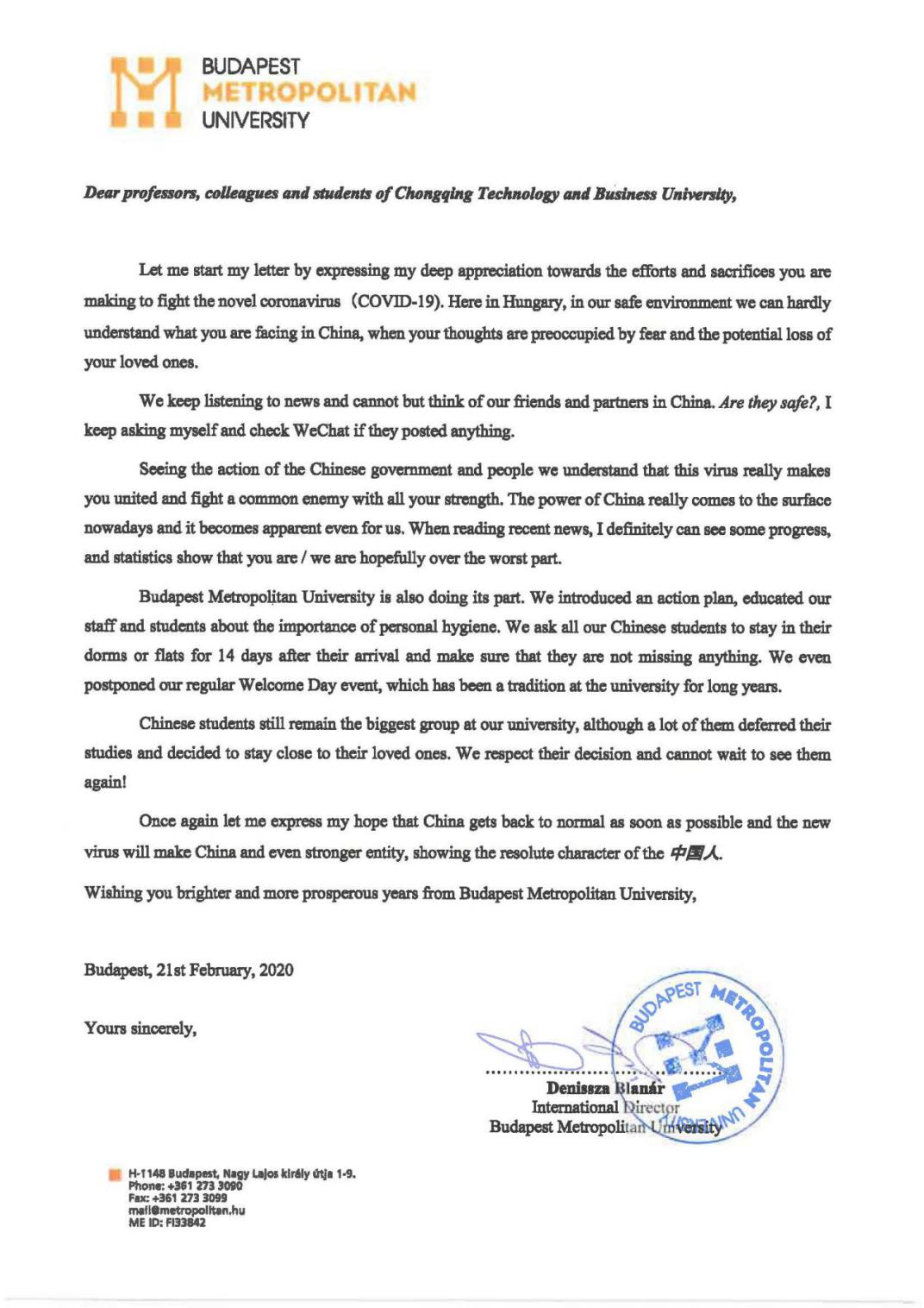 匈牙利布达佩斯城市大学致信关切中国疫情,问候公司师生安康
