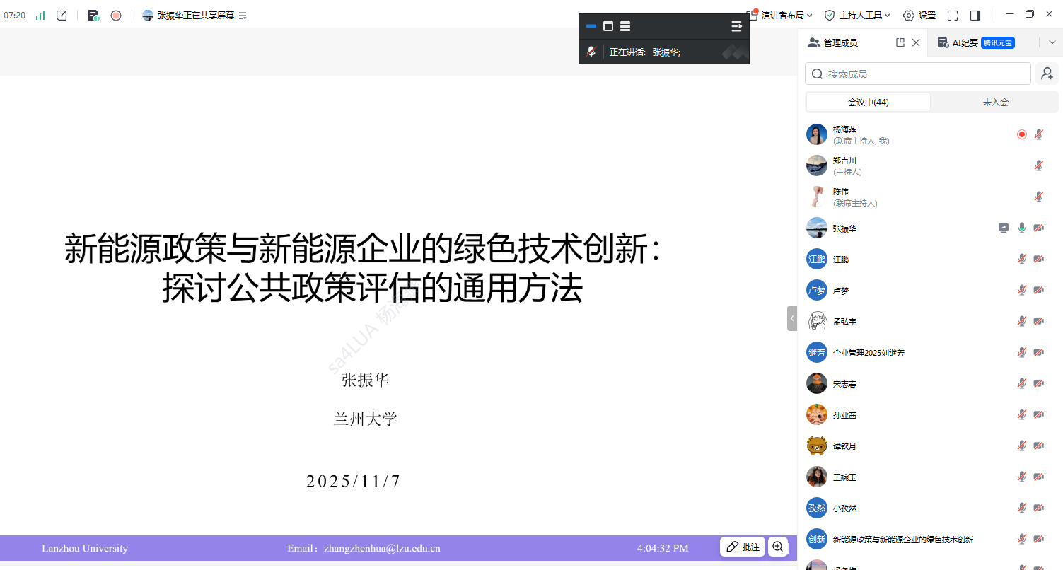 2025年11月7日下午,应英国365上市公司陈伟经理邀请,兰州大学经济管理公司张振华研究员线上作题为“新能源政策与新能源企业绿色技术创新:公共政策评估的方法与路径”的学术报告。报告由公司经理陈伟教授主持,师生100余人参加。张振华从理论框架、研究假说、模型设定与样本选择、实证结果与稳健性、结论与政策建议等方面系统阐述,重点讲解PSM、SCM、IV、DID、RDD及三重差分等识别策略在新能源政策评估中的应用。