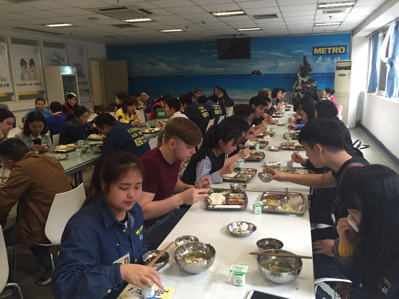 本次认知实习同行的还有来自公司职工院的11名交换生,分别来自泰国、荷兰和芬兰,职工院张轶副经理、周茜和刘茜老师也一同前往。为了让中外员工对麦德龙的管理有切身的体会,麦德龙重庆区域招聘负责人史庆生经理、南岸商场人力资源部谭婷经理还专门安排了师生与商场员工共进午餐活动,在进餐环节与各个层次的员工聊天,增进对企业的了解。人资专业的同学还一对一地为交换生承担起了简单的翻译工作。