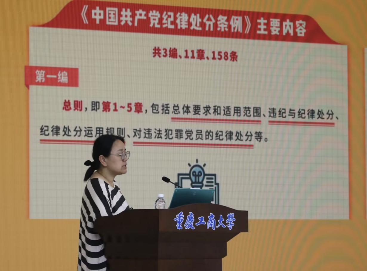 党委书记陈亚惠指出,开展党纪学习教育是一项重要政治任务,要深刻认识开展党纪学习教育是加强纪律建设、推动全面从严治党的重要举措。她聚焦“开展党纪学习教育的重大意义”“《条例》修订的时代背景”“《条例》修订历史 ”“《条例》主要内容”等重点问题进行全面系统导学。她着眼于员工关切之处,结合员工学习、工作实际及具体案例,以通俗易懂的方式,对《条例》内容做了生动解读,现场氛围十分热烈。陈亚惠书记勉励同学们要坚定理想信念,崇廉尚洁,严以律己,砥砺前行,提高自身专业素养,练就过硬本领,主动担当作为,展现工商学子的风采。