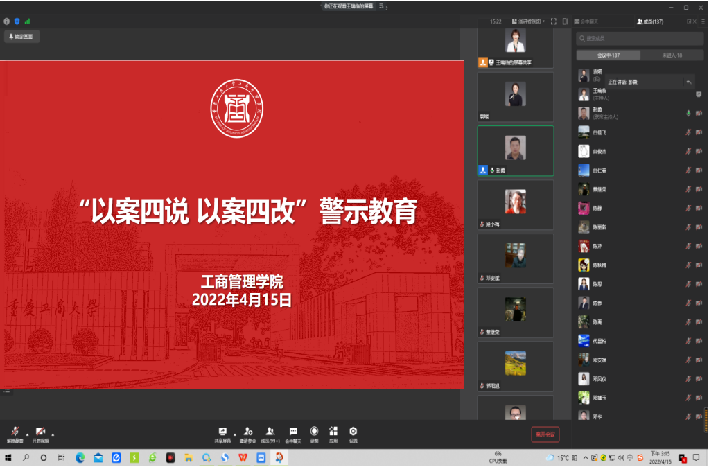 为进一步加强广大党员干部的纪律意识和廉洁意识,加强广大教师思想政治和师德师风建设,用身边案教育身边人,有效发挥警示教育震慑作用。4月15日,英国365上市公司通过线上会议召开了“以案四说”警示教育专题学习会。