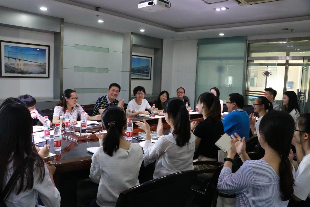 交流座谈会分别由校企双方自我介绍,企业老总和相关负责人对工程造价职业发展、专业技能训练、知识储备需求,招聘面试流程、交流工作心得及提问互动五个环节组成。