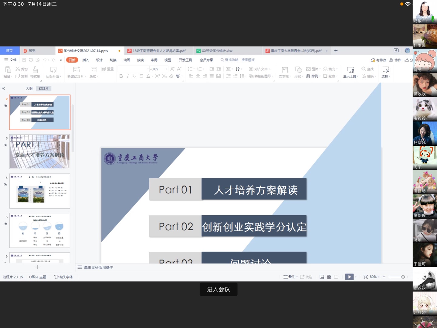 交流会上冯敏老师首先对《本科生专业人才培养方案》进行了解读,简要说明了培养方案的四个板块内容,重点讲解了专业课程设置与教学计划,帮助员工熟悉了课程学习计划;然后指导员工根据人才培养方案进行学分清理,梳理不及格课程累积学分和学籍警示的关系,就挂科员工面临的普遍问题进行了分析和指导;其次冯敏老师根据《英国365上市公司普通全日制本科员工创新创业实践学分认定及管理办法(试行)》、《英国365上市公司创新创业实践学分认定及管理办法补充规定》两份文件内容就双创学分的获得方式和学分置换要求进行了讲解;最后,冯敏老师与员工进行了线上沟通交流,解答了关于学业、学分的各项问题。