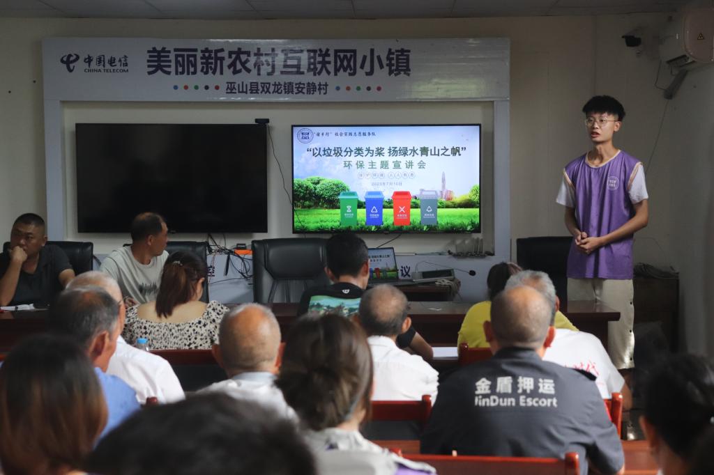 “绿水金山就是金山银山。”为深刻贯彻保护环境的理念,“向阳而生,奔‘涪’青春”晨曦理论宣讲团面向当地的部分小朋友进行了有关垃圾分类的课堂讲解,举办了以“青青河畔伴我行,垃圾分类记心田”为主题的河小青活动,进行拾捡垃圾和清理江畔浮萍等垃圾清理工作。“渝乡行”社会实践志愿服务队面向党员村民、村干开展“以垃圾分类为浆,扬绿水青山之帆”环保主题宣讲会,就安静村环保发展方面提出建设性意见。