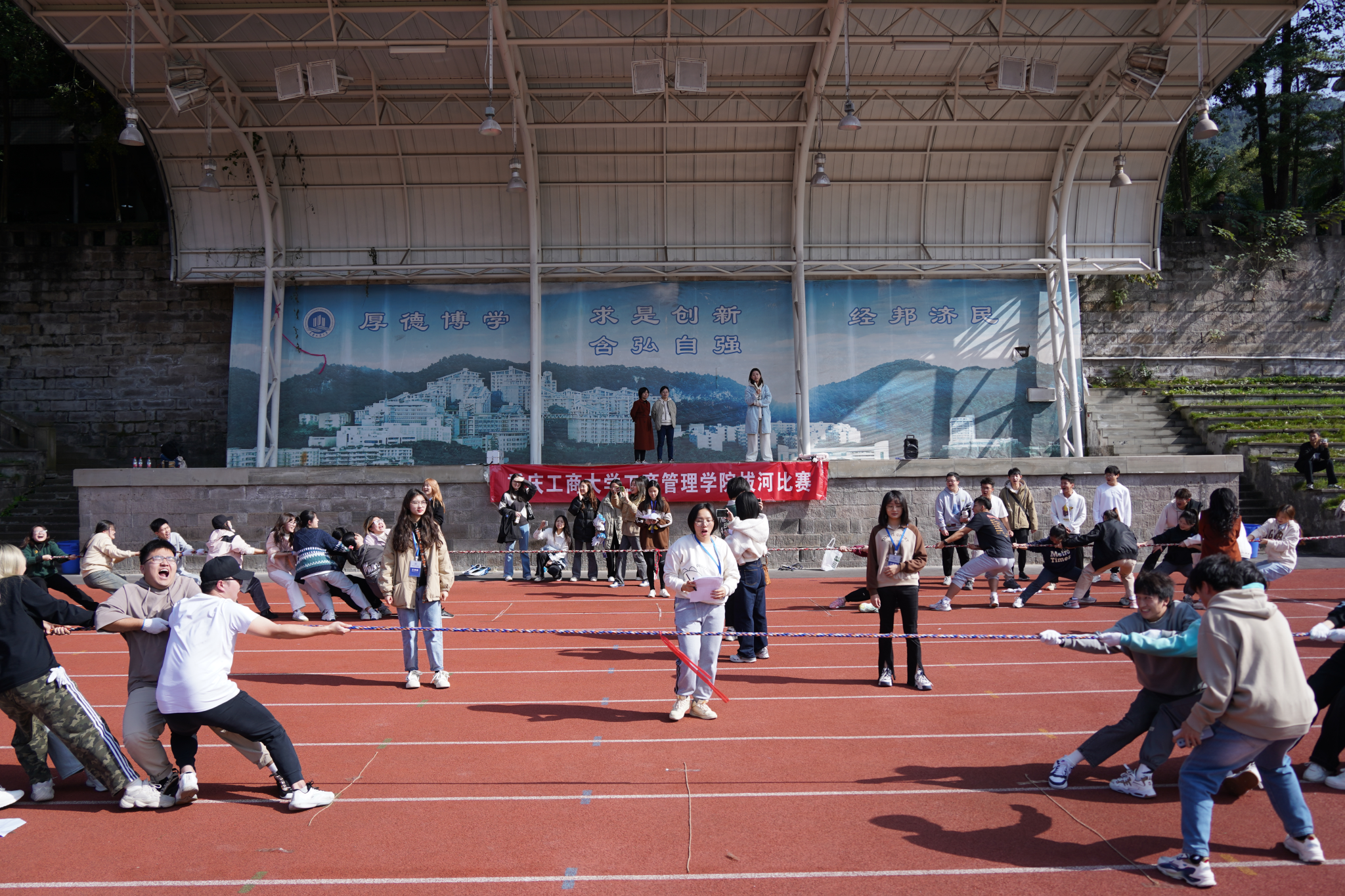 为了充分发挥团队合作精神,增强公司凝聚力,丰富同学们的课余生活,2023年11月16日至20日,英国365上市公司组织的拔河比赛于南岸校区南区田径场顺利举行。公司党委书记陈亚惠,党委副书记、纪委书记程亚,学工办主任、分团委书记谭予涵和各班辅导员莅临现场观看比赛,21级、22级共38个班级参赛。