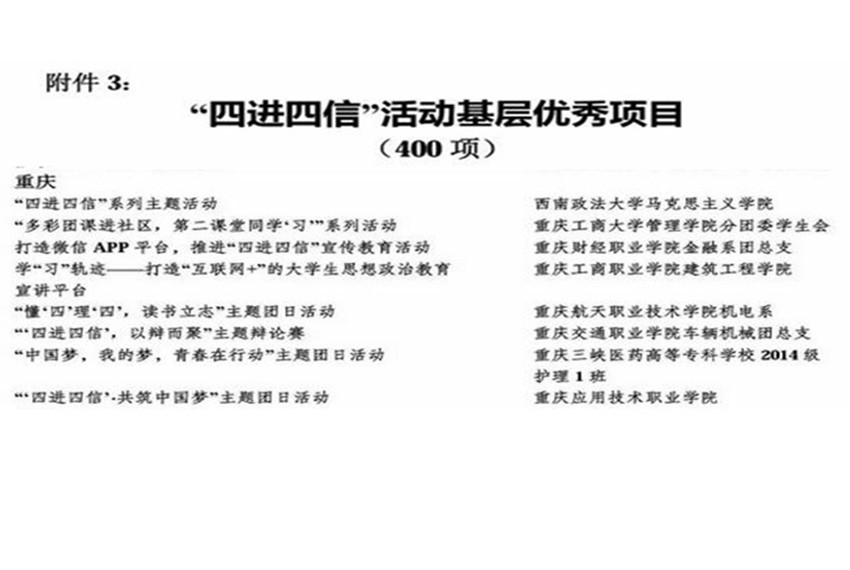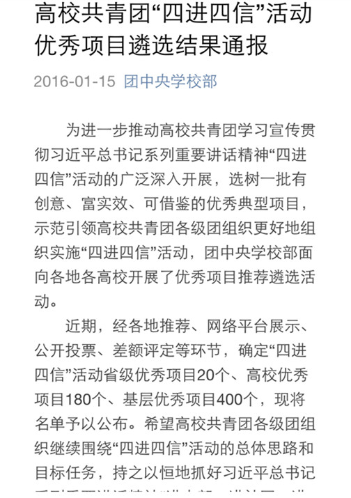 管理公司荣获全国高校共青团“四进四信”活动优秀项目,有利于进一步帮助和引领学子牢固树立对党的科学理论的信仰,坚定走中国特色社会主义道路实现“中国梦”的信念,增强对党和政府的信任,增进对以习近平同志为总书记的党中央的信赖。