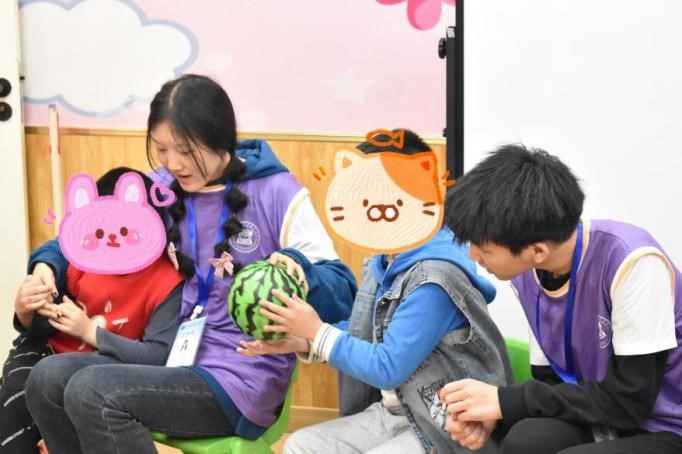 下午1时,青年志愿者们到达了重庆市两路口融智特教中心。等到活动教室布置完成后,小朋友们在老师的带领下进入活动场地。活动伊始,志愿者们和小朋友进行了“小手拍拍”的游戏,以尽快相互熟悉,小朋友们脸上洋溢着开心的笑容,积极主动地参与到游戏中来。紧接着,在志愿者们的帮助下,孩子们完成了“黏土相画框”和“树叶画”的手工制作。制作过程中,这群来自星星的孩子展现了他们独特的创造力,做出了许多漂亮精致的作品。完成制作后,小朋友们进行了短暂的休息,随后便是“丢手绢”和“听歌传球”小游戏,通过游戏进一步拉近了志愿者和小朋友们的距离,整间教室充满了欢乐的气氛。活动最后,志愿者将小面包作为活动奖励送给孩子们,小朋友们欢声一片。