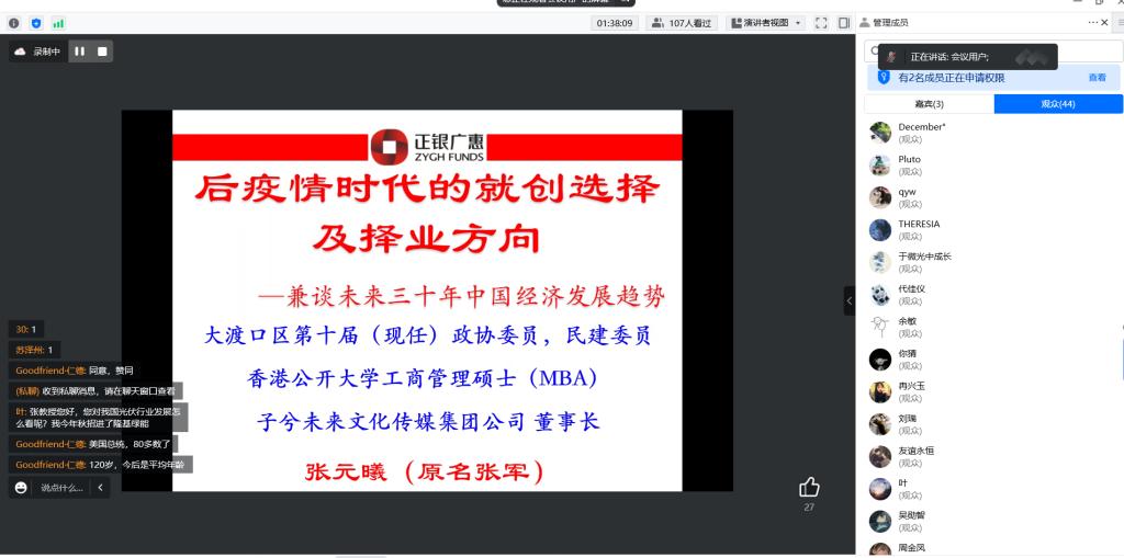 会议开始,张教授对就创业大环境进行分析,同时对“双循环”,“人类命运体”,“一带一路建设”等三个当前时代热词进行剖析,表明现在就业新格局与时代偏好,促进同学认清现实、明晰自身,两者结合做出最适合自己发展的决定,同时学会分析哪个行业需求度更大,未来发展更好做出最优选择。