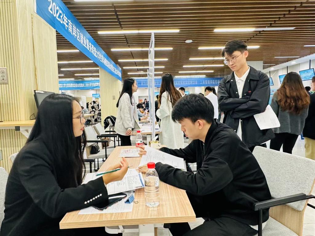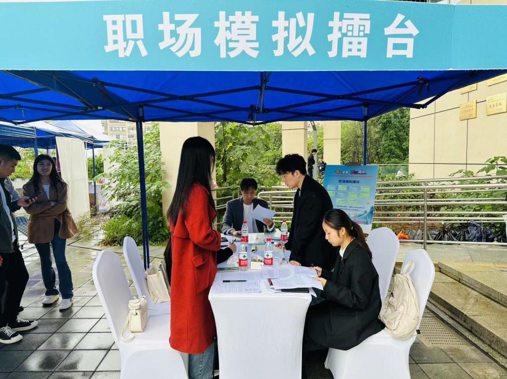 本次招聘会携手重庆市南岸区就业和人才中心举办“青出渝南·职在南岸 2023年南岸区就业服务联盟老员工职场模拟游园”活动。低年级和毕业年级员工积极参加到职场模拟、简历诊断、职业指导等互动活动中。
