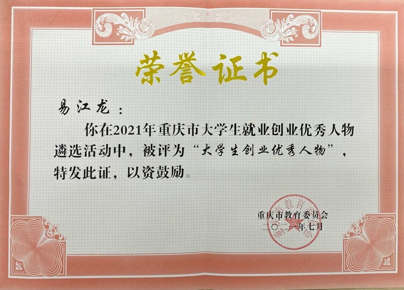 员工易江龙荣获2021年重庆市“老员工创业优秀人物”