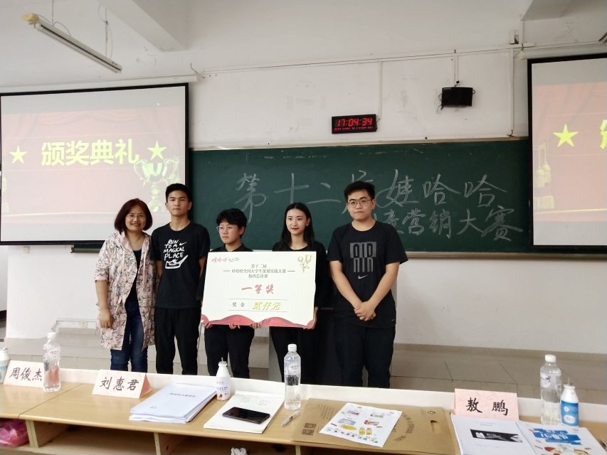 本次校内赛决赛在主持人的讲话后拉开帷幕,在现场工作人员和主持人的共同配合下,九支参赛队伍依次上场进行了PPT讲解、创意环节展示与现场答辩,给现场观众带来了精彩纷呈的展示效果。在比赛的最后,刘惠君副教授对比赛做了总结,她对同学们的创意营销方案进行了肯定,也对同学们在这个比赛中付出的努力与汗水表示赞赏。当所有参赛队伍展示完毕之后,便是精彩的颁奖环节了,在这场比赛中,摘得此次比赛桂冠的是由17级工商管理二班徐宸威同学带领的创锋团队,这支队伍由七位工商管理专业的同学和一名机电专业的同学组成,充分展现了公司工商管理专业的风采;同时,夺得二等奖的队伍是黑洞队,夺得三等奖的队伍是搞点事情队与阿里哈哈队,随后分别由三位评委嘉宾为四支获奖队伍进行了颁奖仪式与合影留念。至此,本次营销大赛校内赛决赛圆满落幕!
