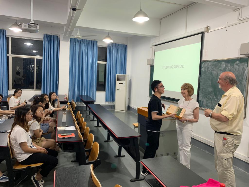 此外,Johnson教授夫妇还分享了在国外的大学课堂上的一些教学的方式,比如Lecture, Seminar/Tutorial Group, Workshop的具体形式及区别,特别强调了在学术写作中规范的引用的重要性,许多中国职工就是在这个问题上吃了大亏。同时,还对中国员工在国外大学如何尽快适应环境、参加社团活动、食宿、业余生活等作了精彩而幽默的介绍。分享结束后,该班高若凡同学代表全班向Johnson教授夫妇赠送了小礼物。