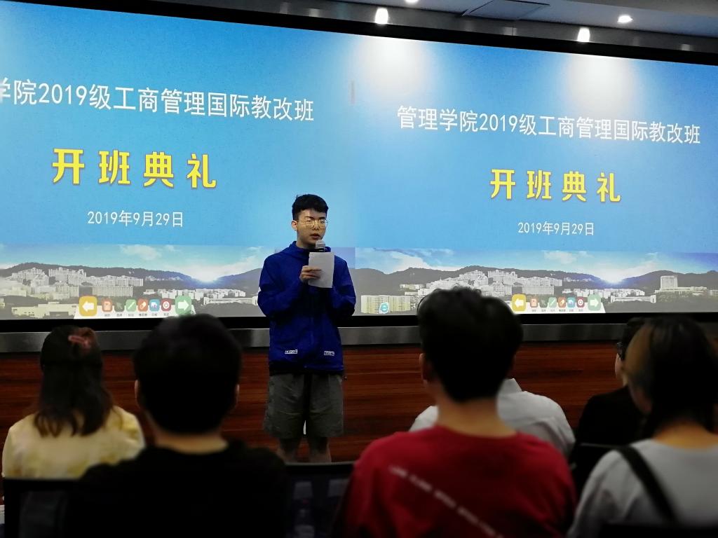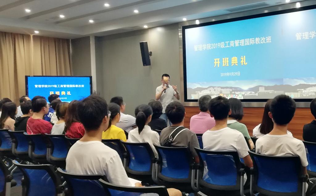 2019929下午2:30,管理公司2019级工商管理国际教改实验班开班典礼在主校区新图书馆智慧教室隆重举行。