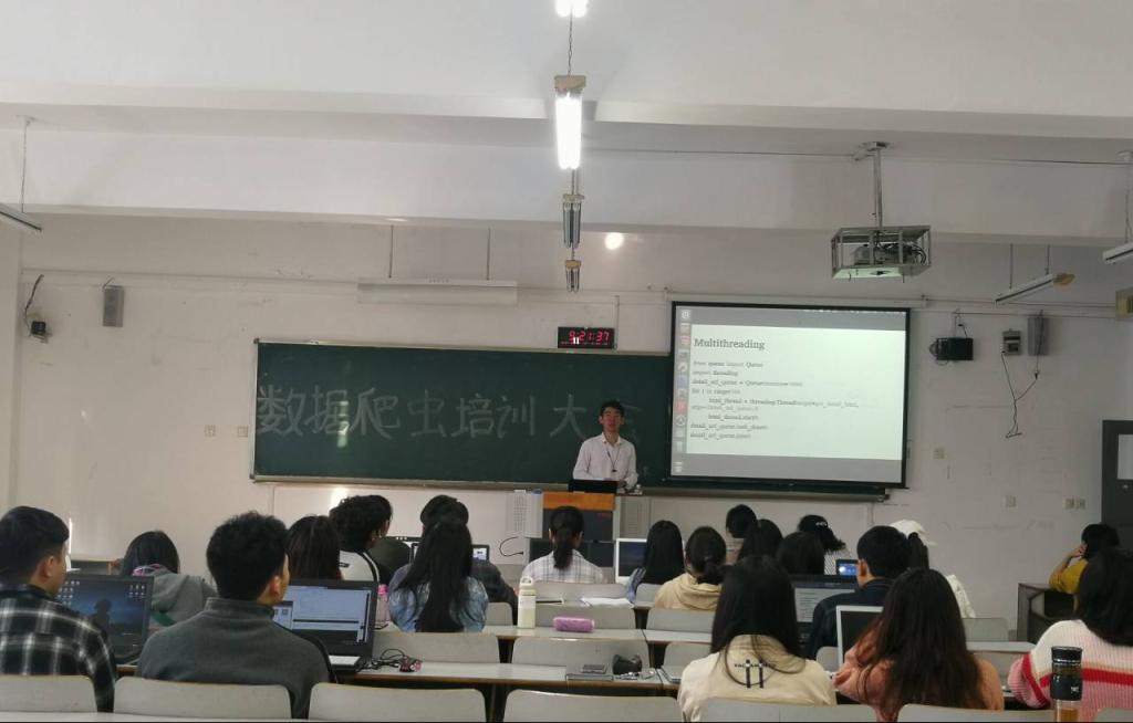 早上9点整,培训大会正式开始。大会上,吕老师从Python基础、如何构造一个爬虫、反爬虫和反反爬虫、crapy框架这四个方面对爬虫的知识进行了清晰地讲解,同学们认真聆听,并用自带的笔记本电脑跟随老师的演示进行操作,现场学习氛围浓厚,同学们学习热情高涨。同时,出席的本次培训大会的老师们也对培训内容及模式表示高度认可,并希望同学们通过此次培训能提高自身爬虫分析能力,在之后的比赛中更好地展现自我。