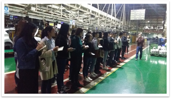 实习活动由企业人员讲解、员工参观汽车总装车间,以及观看企业发展历史与现状的资料等环节组成。在车间门口,企业人员为大家介绍了总装环节在企业中的地位和作用。在强调了安全注意事项之后,同学们走进了现代化的生产装配车间,一边听专业技术人员的介绍,一边观察生产线上的一道道工序,和一个个越来越成型的半成品。在参观的同时,刘惠君老师不断根据生产现场和企业人员给出的数字来说明生产运作课堂上讲过的原理(图一)。黄洁、魏明等带队老师也不时提醒大家应该重点关注的参观对象。同学们边听边看,认真地做着笔记。(图二)在观看企业的宣传资料过程中,企业人员向同学们介绍了长安汽车公司的主要历史、组织结构、人才保障、合资企业、现有品牌和产品线、文化建设、研发布局、新技术的发展和应用等全面概况。(图三)在参观了企业荣誉墙之后,同学们明白了正是因为长安人的这种积极进取精神与认真严谨的工作态度,才会有今天长安汽车生产销售累计突破1000万辆的优异成绩。在参观结束后,老师与同学们进行了合影留念。(图四、图五、图六)