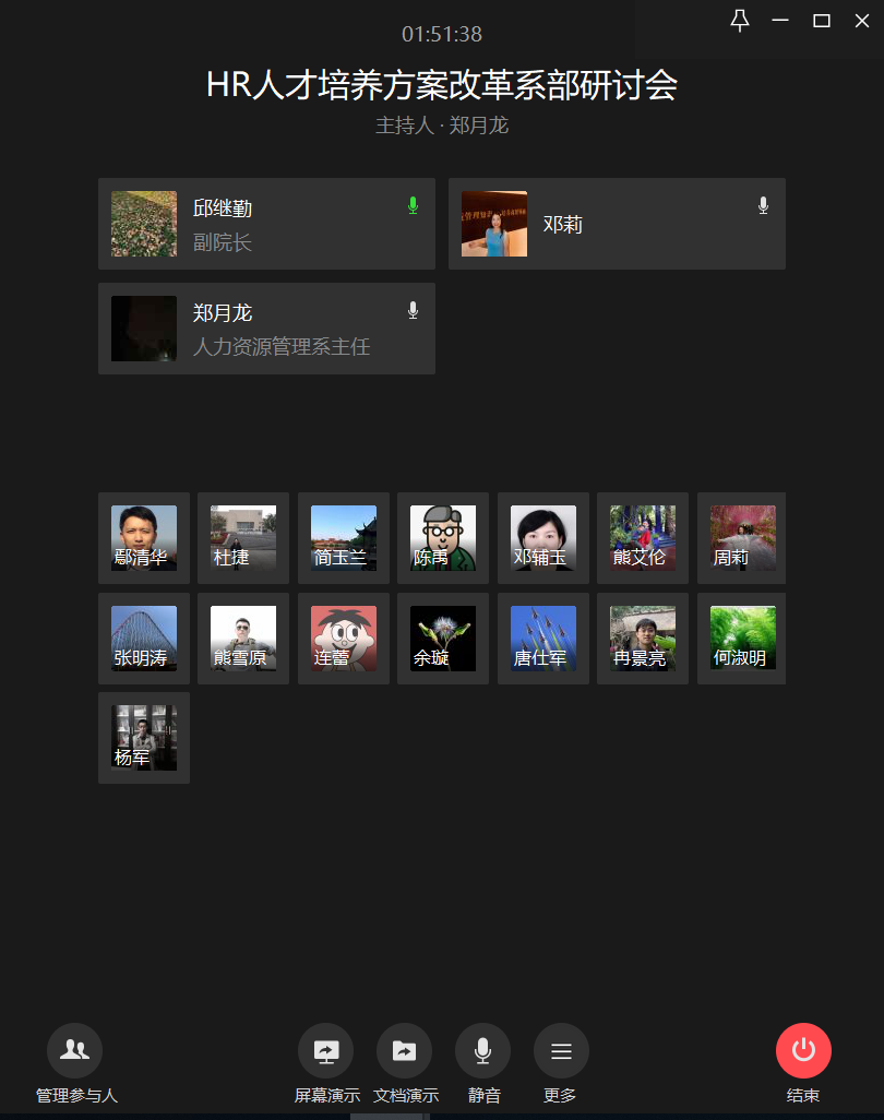 8月10日晚20点,人力资源管理专业2020级人才培养方案系部研讨会通过企业微信如期举办。公司副经理邱继勤教授,人力资源管理系主任郑月龙博士、副主任熊艾伦博士以及人资系全体教师参加了本次会议,会议由郑月龙博士主持。