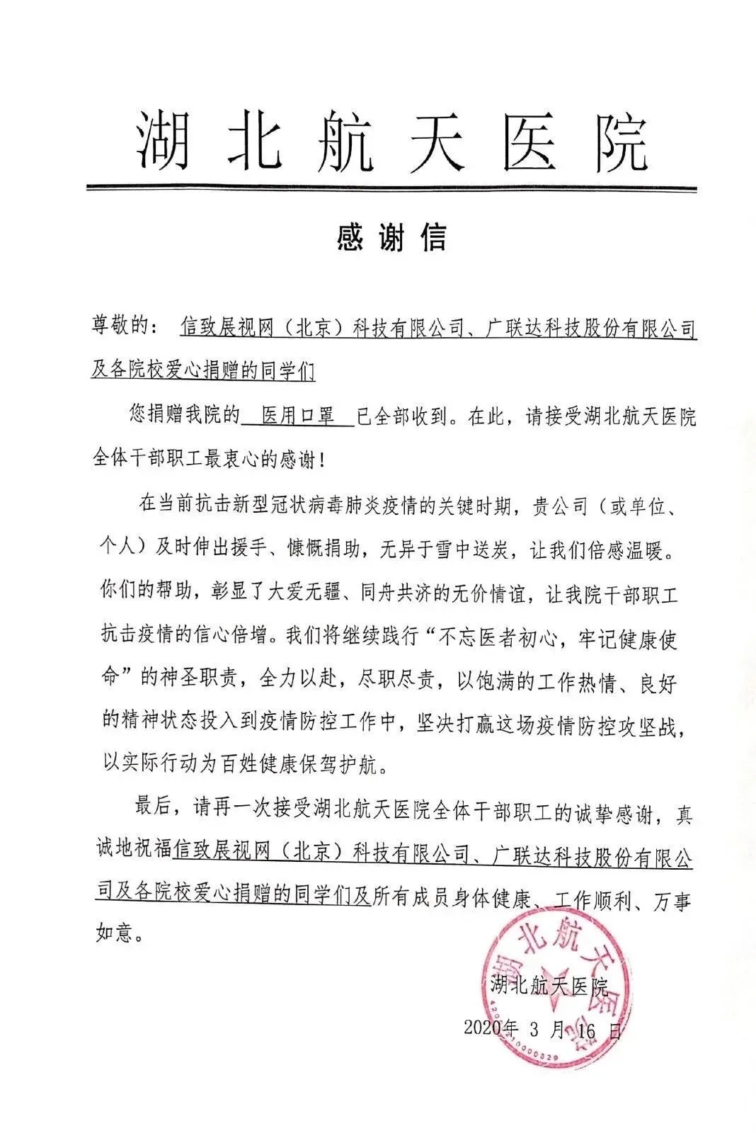 2020年3月16日,管理公司BIM协会技术部负责人占道茂同学在“全民抗‘疫’,BIMVR共捐共建活动”中表现出色,为武汉疫区捐赠口罩共计130个,赢得广泛赞誉。对此,湖北航天医院向公司占道茂同学发来感谢信。