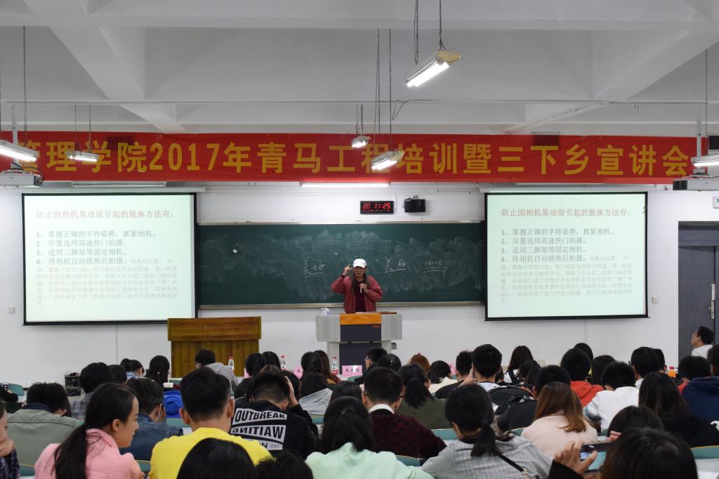 大会第二阶段由管理公司“三下乡”社会实践重点团队的三名成员依次带来三下乡总结汇报。分团委员工会代表、义工志愿者协会代表、党支部代表分别用三分钟的演讲与大家分享了本年度的“三下乡”之旅以及他们弥足珍贵的“三下乡”收获。分党委王静副书记对同学们的暑期“三下乡”社会实践工作表示了充分肯定,并结合习总书记对青年的殷切期望,对管院员工干部提出两点要求:一是要热爱祖国,坚定立场信念,紧跟时代步伐,自觉将个人发展与祖国命运结合起来,要认真学习领会党的十九大精神,要深刻领会习总书记讲话的丰富内涵,准确把握精神实质,内化于心、外化于行。二是在思想和行动上与党中央保持一致,要将十九大精神贯彻落实到日常的学习生活中,充分发挥模范带头和桥梁纽带作用,团结带领全院员工志存高远、勤奋求学、锻炼身体,苦练本领,以实际行动报效祖国。最后,李平老师为同学们进行了新闻摄影技术培训。李平老师通过展示各类新闻照片,以实际案例向同学们讲解了各个摄影知识点在实际拍摄中的应用,为本次青马工程培训大会画上了圆满句号。