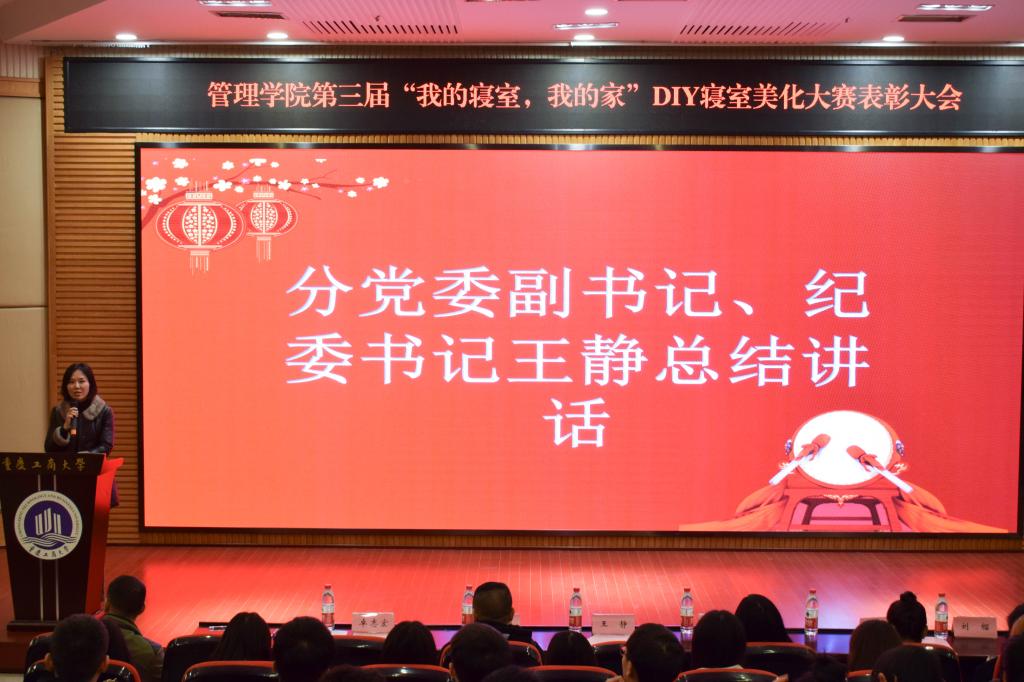 为了营造健康、文明、积极的寝室文化氛围,促进同学之间的交流沟通,创造文明舒适的学习生活环境,丰富同学们的老员工活,2019年11月19日由管理公司主办、管理公司楼栋管理委员会承办的第三届“我的寝室我的家” DIY寝室美化大赛表彰大会在博智楼7200报告厅举行。管理公司分党委副书记、纪委书记王静,员工处公寓管理科陈剩勇,管理公司学工办副主任谭予涵以及辅导员卓志宏、刘榴、张檬出席了本次表彰大会。