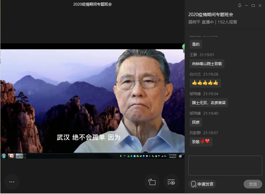 聂树平老师通过视频将复旦大学中国研究院经理张维为教授请到直播间,为同学们解读“中国抗疫的世界意义”。张教授通过美国和澳大利亚如何应对森林火灾,2005年美国如何应对卡特里娜飓风灾害,2009年美国如何应对H1N1病毒等具体事例的对比,彰显了我国社会主义制度集中力量办大事的优越性,有力攻破西方社会别有用心的诋毁言论。同时又以世界卫生组织总干事谭德赛等人士对中国应对疫情行动的赞赏,引导同学们客观理性地对待国际社会舆论,绝不受西方不当言论的蛊惑,坚定对党和国家的热爱,绝不信谣传谣、以讹传讹,做新时代的有为青年。