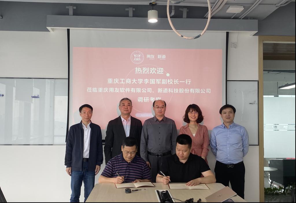在用友软件有限公司、新道科技股份有限公司调研会上,校企双方就高校人才培养模式进行了深入交流,共同签署了校企合作协议。重庆用友软件有限公司人力资源部总监何爱妮重点介绍了实习生招聘、培养、职业发展等过程中存在的问题以及双师型教师培养方案。新道科技股份有限公司教育研究院经理宋健详细介绍了企业的人才需求,知识面宽,学习能力强,数字化技术应用能力高的员工更受企业欢迎。校企合作培养人才过程中,要加强专业建设和实践育人,构建产业公司模式(现代产业公司,未来技术公司、特色软件公司等),实现“产学研”一体化,跨专业提升员工综合能力。
