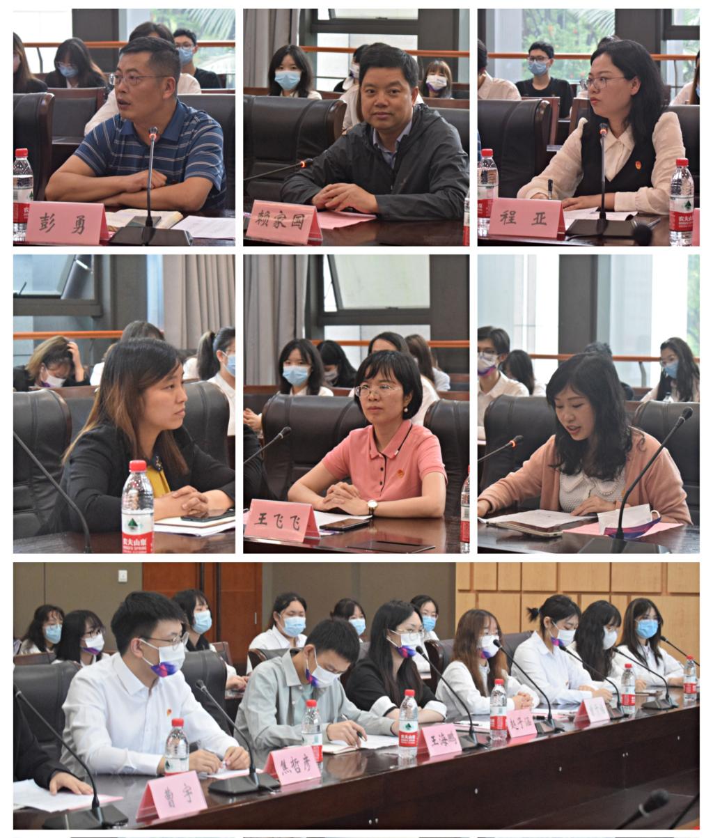 座谈会分成两个阶段,第一阶段为师生交流发言。交流中,教师代表王飞飞谈到一代人有一代人的长征,历史长河中仁人志士前仆后继,为中华开拓新天地,百年之时,青年学子发出“请党放心、强国有我”之声,为中华民族的伟大复兴奋勇向前是新一代青年人的历史使命。谭予涵谈到青春之花应随璀璨阳光绽放,青春正当时,风华正盎然,我们更应守护青春、实践青春、保障青春。禹洋春谈到中国共产党是始终保持青春特质的党,是永远值得青年人信赖和追随的党,传承党的精神,做党的后备军,当好党的助手,努力向党组织靠拢。员工党员代表王海鹏以自身为例,向大家分享自己的任职经历和入党初心,尽心敬业尽责是他的工作原则,踏实是为人民服务的前提,实践是不空谈先锋模范的要诀;优秀毕业生代表赵子涵分享了就业经验,找准自我社会定位,有目标有计划的选择,是肩负时代重任的新青年应该明白的使命;曾千禧则走上了追求学业的道路,跨考的艰难和信念的支撑,让她明白爱国主义精神不仅停留在表层,强调文化自信、思政教育,鼓励年轻人有一份热发一分光是她的新目标;员工干部代表焦哲彦强调员工干部工作要有自觉担当,注重沟通协作,才能在为校服务中找到自我价值;团支部书记代表曹宇分享了自己在团工作的点滴,鼓励工商学子为校为院出一份力。