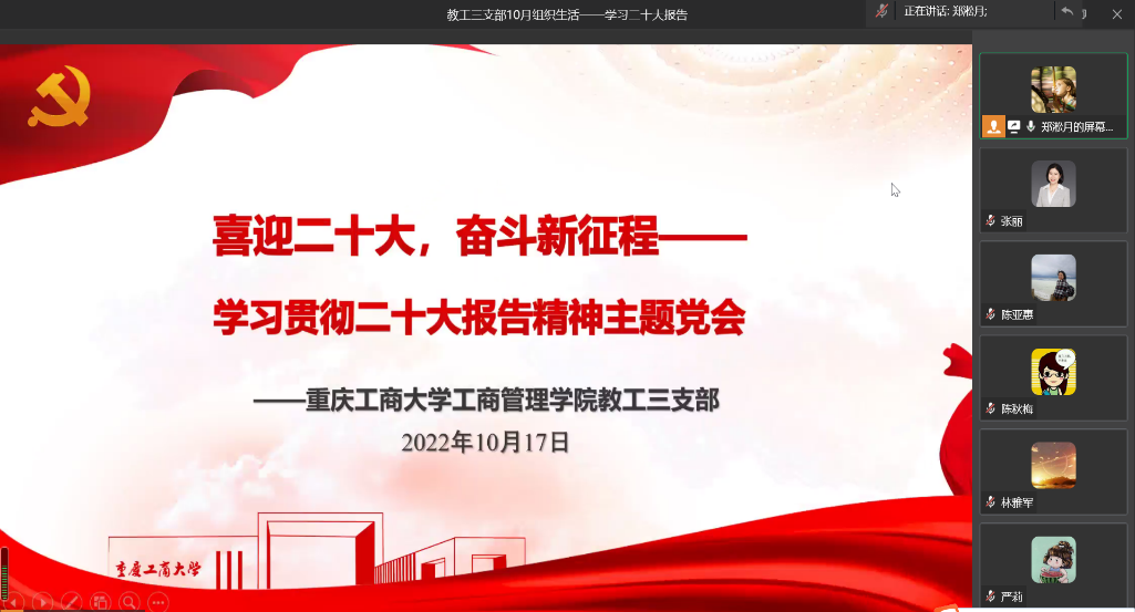 10月17日晚7点,教工三支部以线上方式召开“喜迎二十大,奋斗新征程”主题党会。会议由支部书记郑淞月同志主持,以图解方式带领大家学习回顾了二十大报告15个方面的主要内容,并组织全体支部党员对学习感受展开热议。