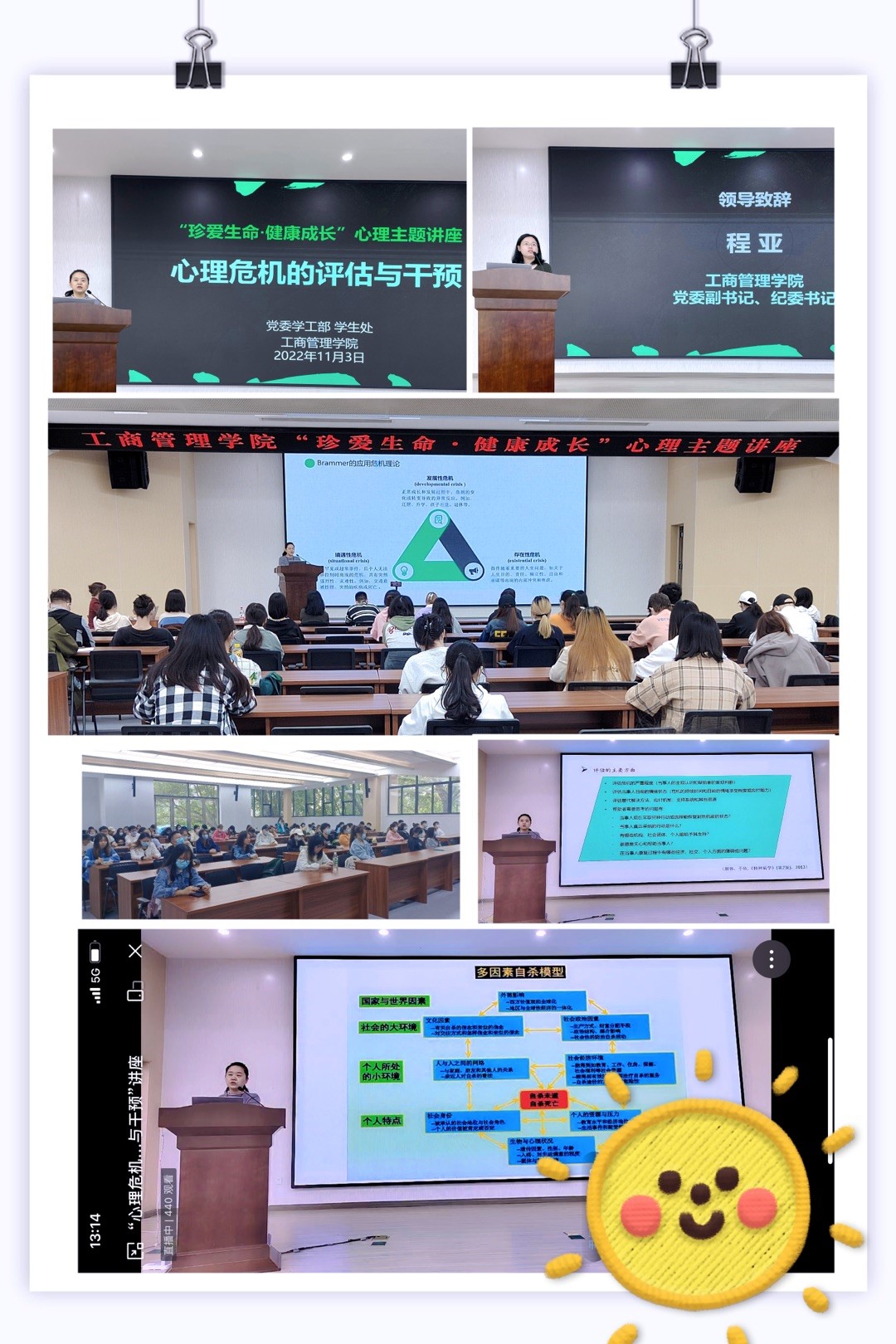 讲座中,公司心理中心主任胡佳怡老师就“危机的表现及评估”、“认识自杀”、“危机干预”三个方面对同学们进行了专业的培训。主讲老师通过列举相关事例,联系现实生活,从寝室问题延伸到校园心理健康问题,其鞭辟入里的分析引发了同学们的思考。
