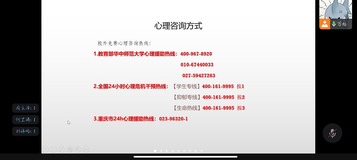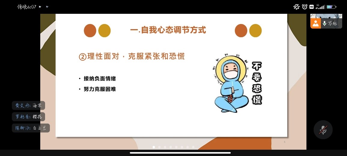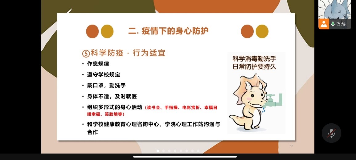 活动中,主讲人就疫情反复之下,心理委员自我心态调节方法、疫情下的身心防护、心理健康工作开展途径三个方面为心理委员进行了相关介绍。公司心理委员认真观看了直播并积极地参与到了直播的互动中,分享了各自疫情下的心理状态。在此次活动中,心理委员们加深了对疫情环境下自身身心状态调节方法的了解,也明确了如何在疫情下给予同辈们更多的帮扶,携手共渡难关。
