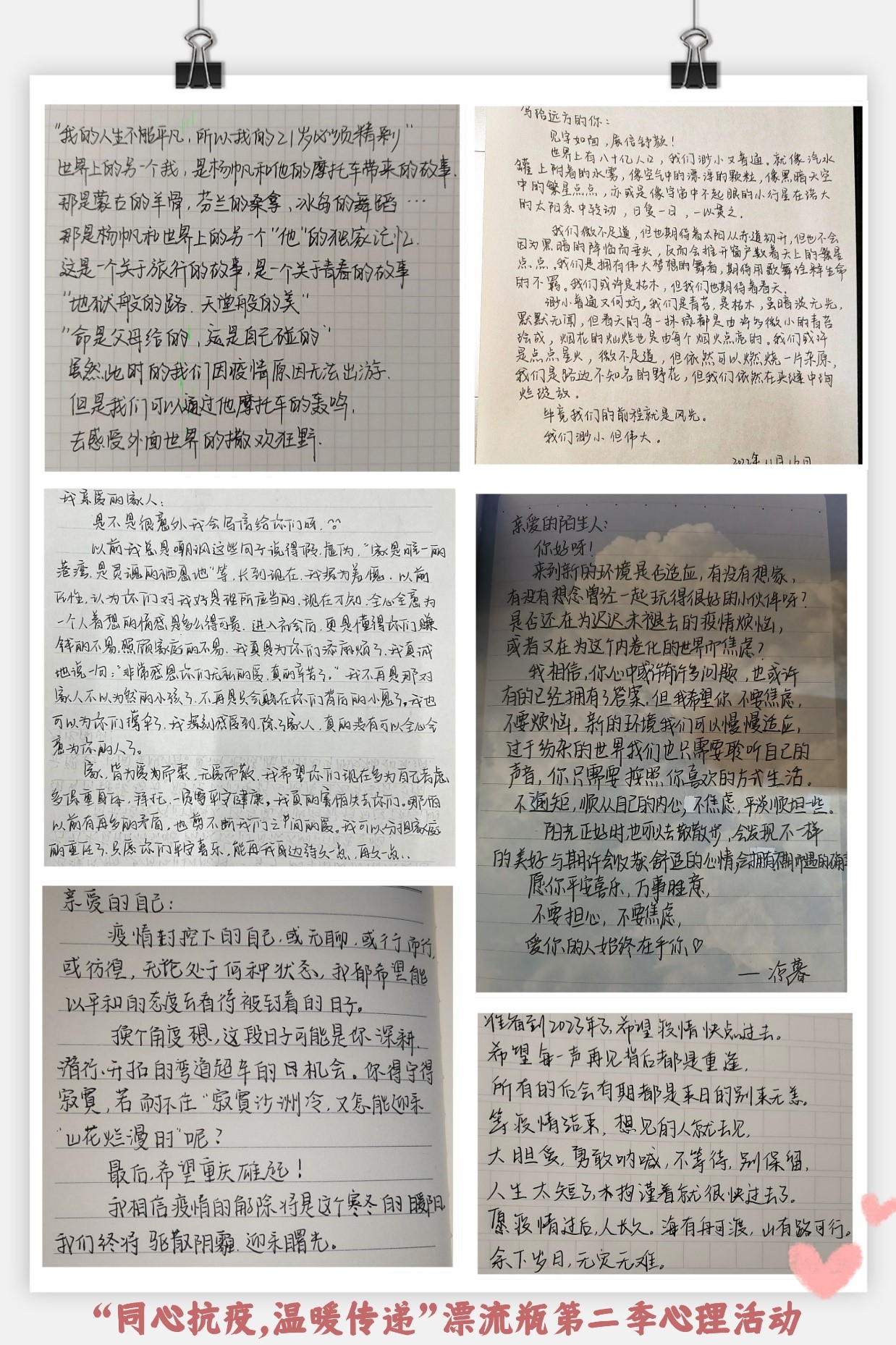 “绚丽的生命离不开健康的心理,拥有健康的心灵和阳光的心态,才能拥有五彩斑斓的生活”。本次漂流瓶活动,为同学们创设了自我表达、相互交流的机会,有利于拓宽人际交流圈,増进同学间的了解,深化友谊,舒缓心理压力,为公司和谐校园建设涂上了一抹温暖健康的“心”色彩。