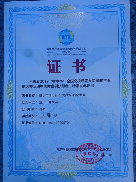 大赛共收到来自武汉大学、对外经贸大学、上海交通大学等全国39所高校的73个经管类实验教学参赛案例,经过专家匿名评审,共有38个经管类实验教学案例进入决赛,其中经济组18项,管理组20项。决赛分为现场答辩、专家评委评分、观众评委现场投票等环节,经过现场激烈角逐,最终评出特等奖4名,一等奖6名,二等奖8名,三等奖10名,优秀10名。公司管理公司工程管理系肖艳老师的“基于市场比较法的房地产估价模拟”教学案例荣获管理组三等奖,为历年来公司教师首次获得奖项,充分显示了公司在案例教学方面取得的巨大进步与优异成绩。